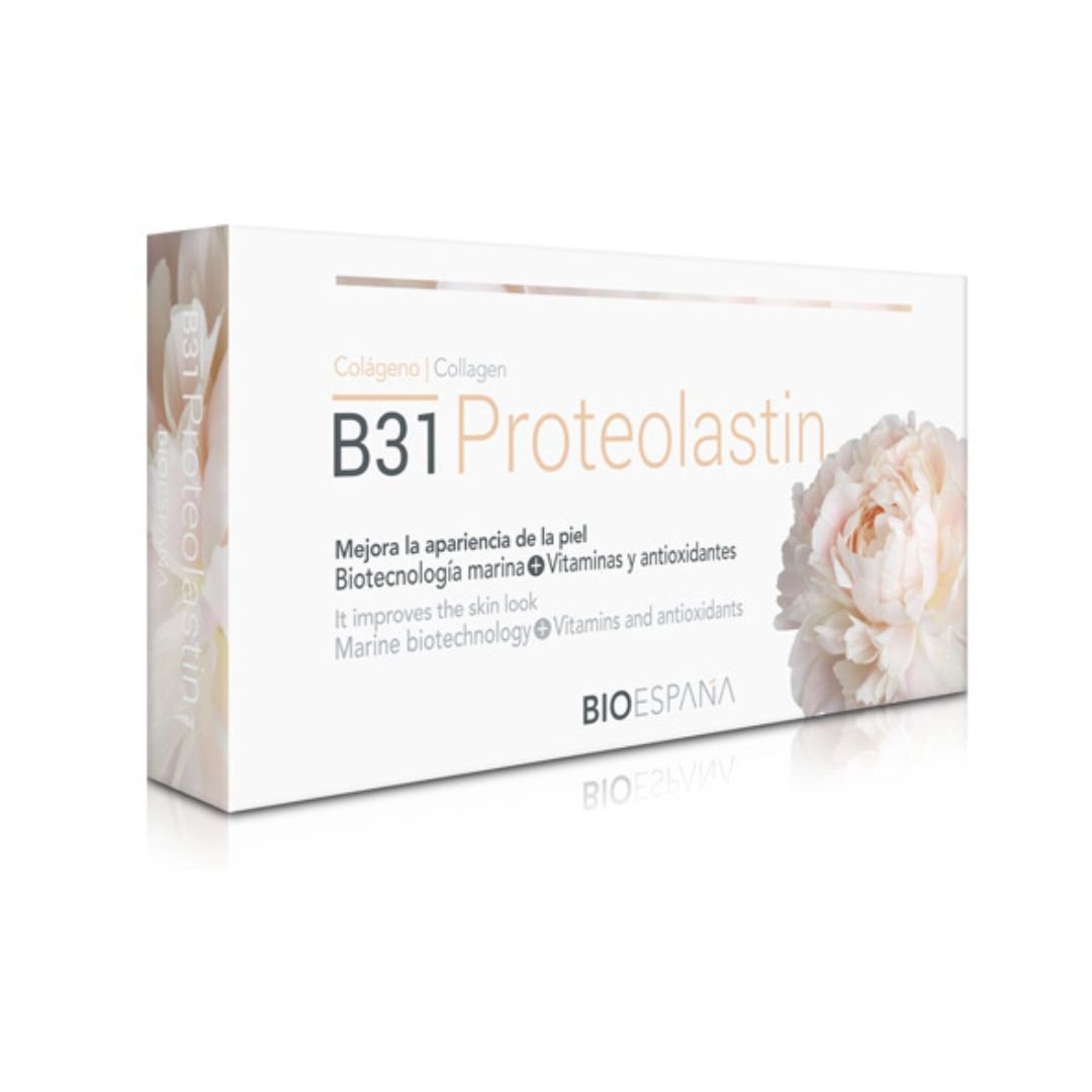 B31PROTEOLASTIN es un complemento alimenticio que contribuye al mantenimiento de una piel joven e hidratada. Aporta firmeza, elasticidad e hidratación a la dermis, contrarrestando los signos del paso del tiempo en la piel.