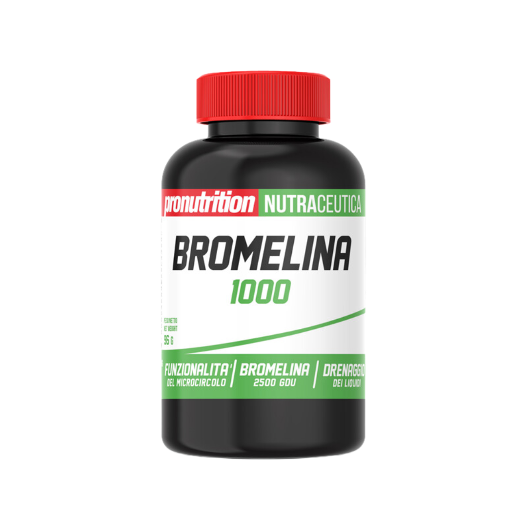 Pronutrition 1000 bromelina contiene 1000 mg por comprimido. La bromelina se conoce químicamente desde 1876 y fue introducida en 1957 como sustancia terapéutica y desde entonces se han publicado numerosos estudios sobre sus aplicaciones terapéuticas. El término genérico bromelina se refiere a un grupo de enzimas proteolíticas (o proteinasas), que están presentes en particular en el tallo de la piña y, en parte, también en el jugo. La bromelina puede estar directamente implicada en la descomposición de las proteínas, de hecho, a partir de numerosos estudios se puede observar cómo la bromelina tiene la capacidad de facilitar la digestión de las proteínas, descomponiéndolas en péptidos. También encuentra su aplicación en los estados inflamatorios y en la descomposición de las proteínas. reducción de la hinchazón, tendiendo a reducir las moléculas proinflamatorias, además de ser útil en el drenaje de los líquidos corporales (pesadez en las piernas) y el funcionamiento de la microcirculación (piña). También se cree que puede estar directamente implicado en la lucha contra los síntomas de la sinusitis y la congestión nasal.